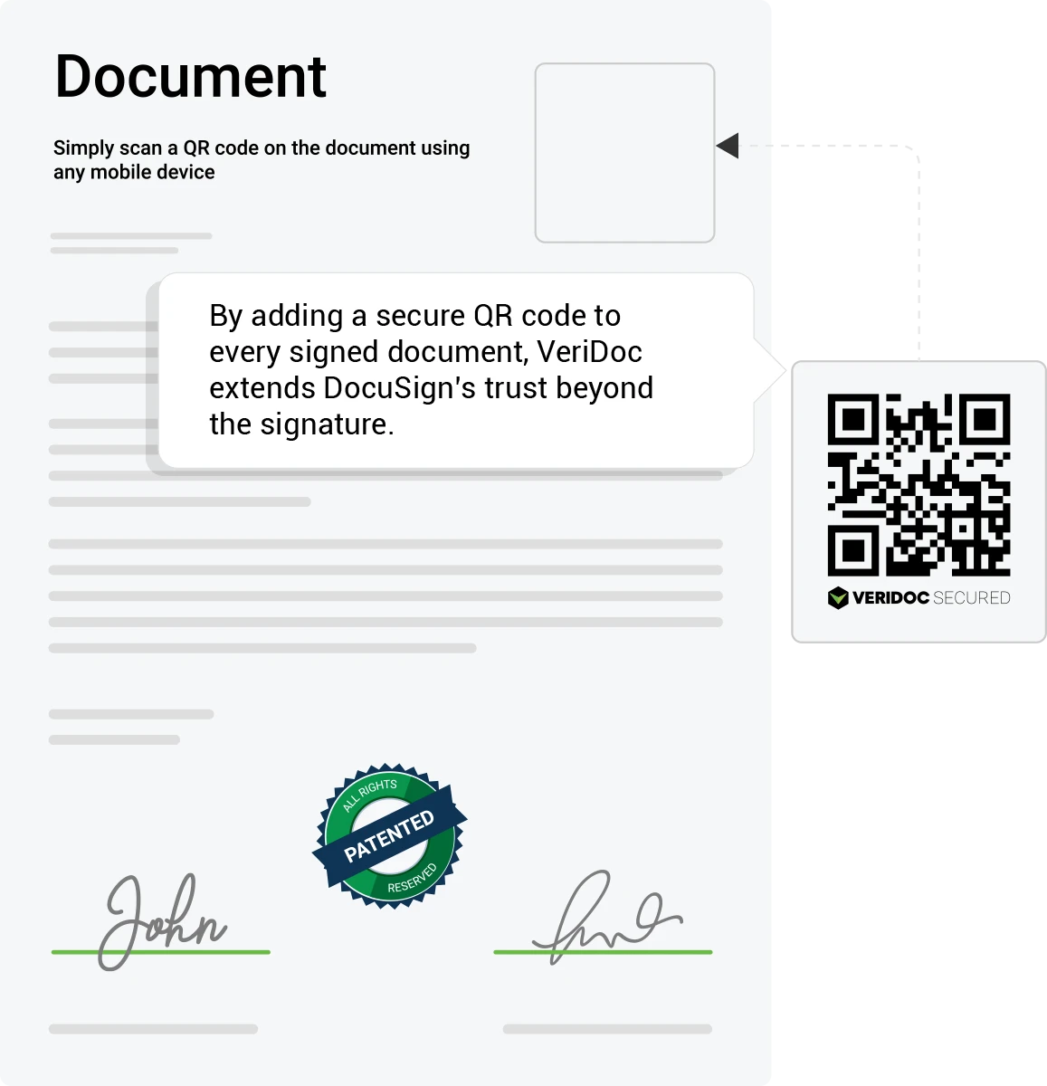 VeriDoc Global enhances DocuSign by adding blockchain-powered verification to signed documents. A secure QR code is attached to each document, allowing anyone to instantly confirm that the file has not been altered after signing.