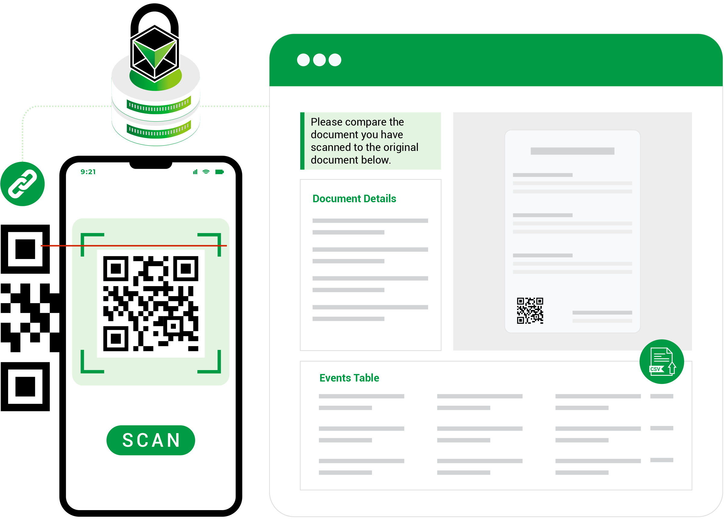 Drag and drop a unique, secure QR code onto any document. A quick scan confirms the document