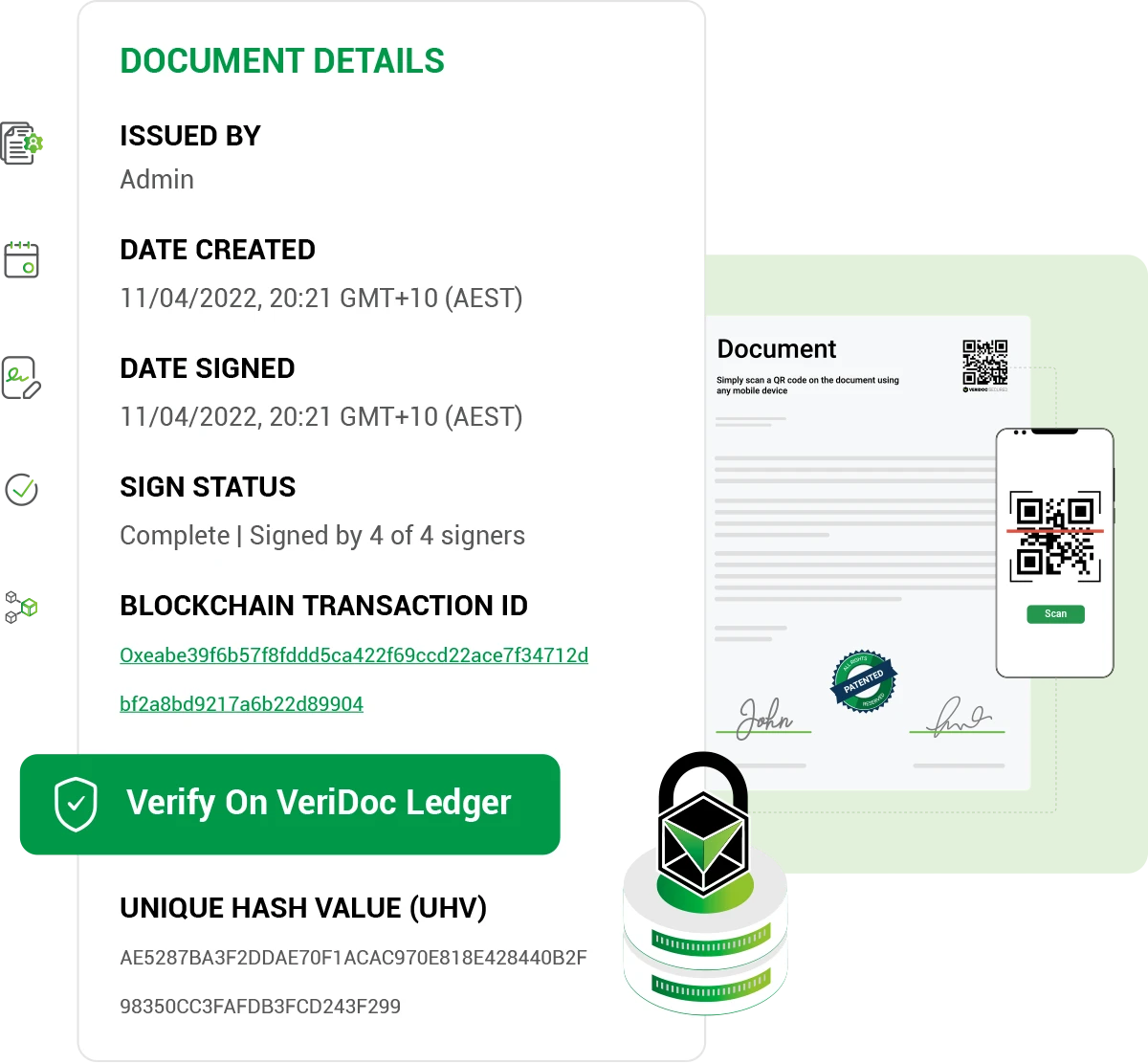 Add a blockchain secured QR code to every document, close deals in minutes and prove authenticity forever.