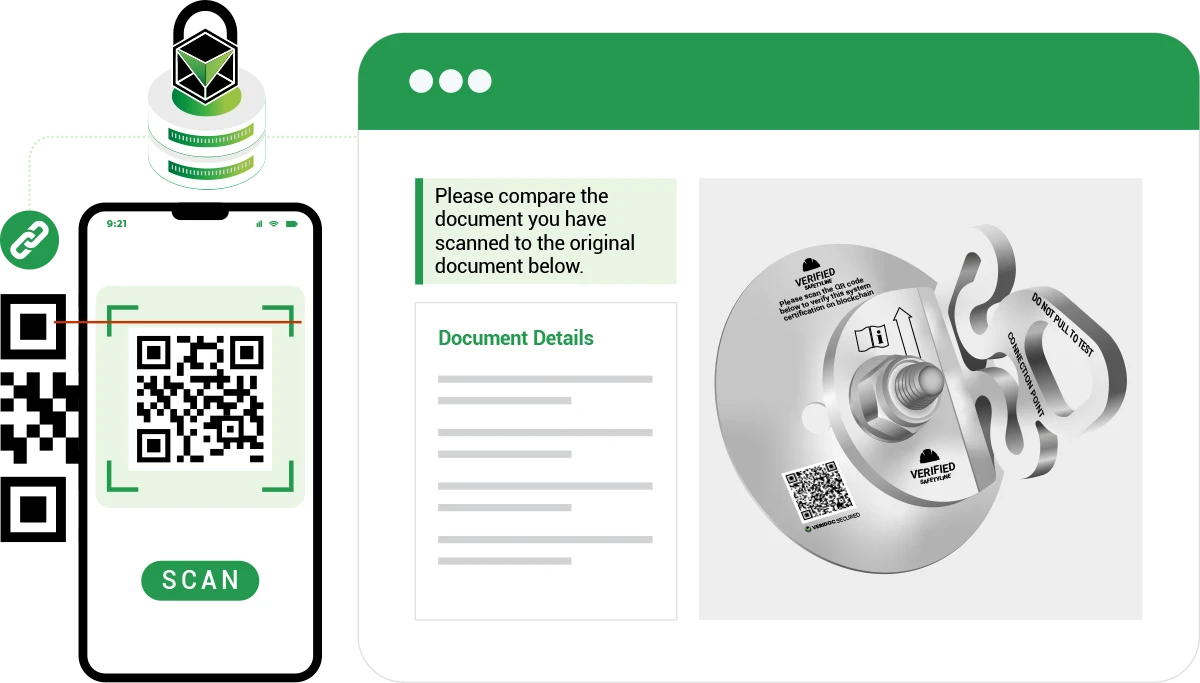 The Verified Safetyline Safe Point Steel POC demonstrates how VeriDoc Global secures critical safety and compliance documents for construction and industrial environments. Each product is linked to a blockchain-verified QR code that confirms authenticity, inspection status, installation details, and compliance records, ensuring complete trust in safety-critical equipment.