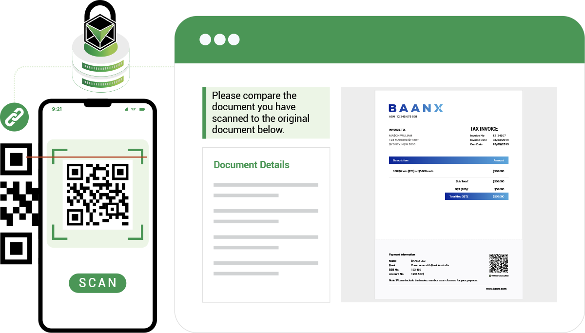 When scanned, the system compares the live invoice data with the stored hash and delivers an immediate authentication result. This eliminates the need for manual validation and significantly reduces the risk of payment fraud or misdirection.