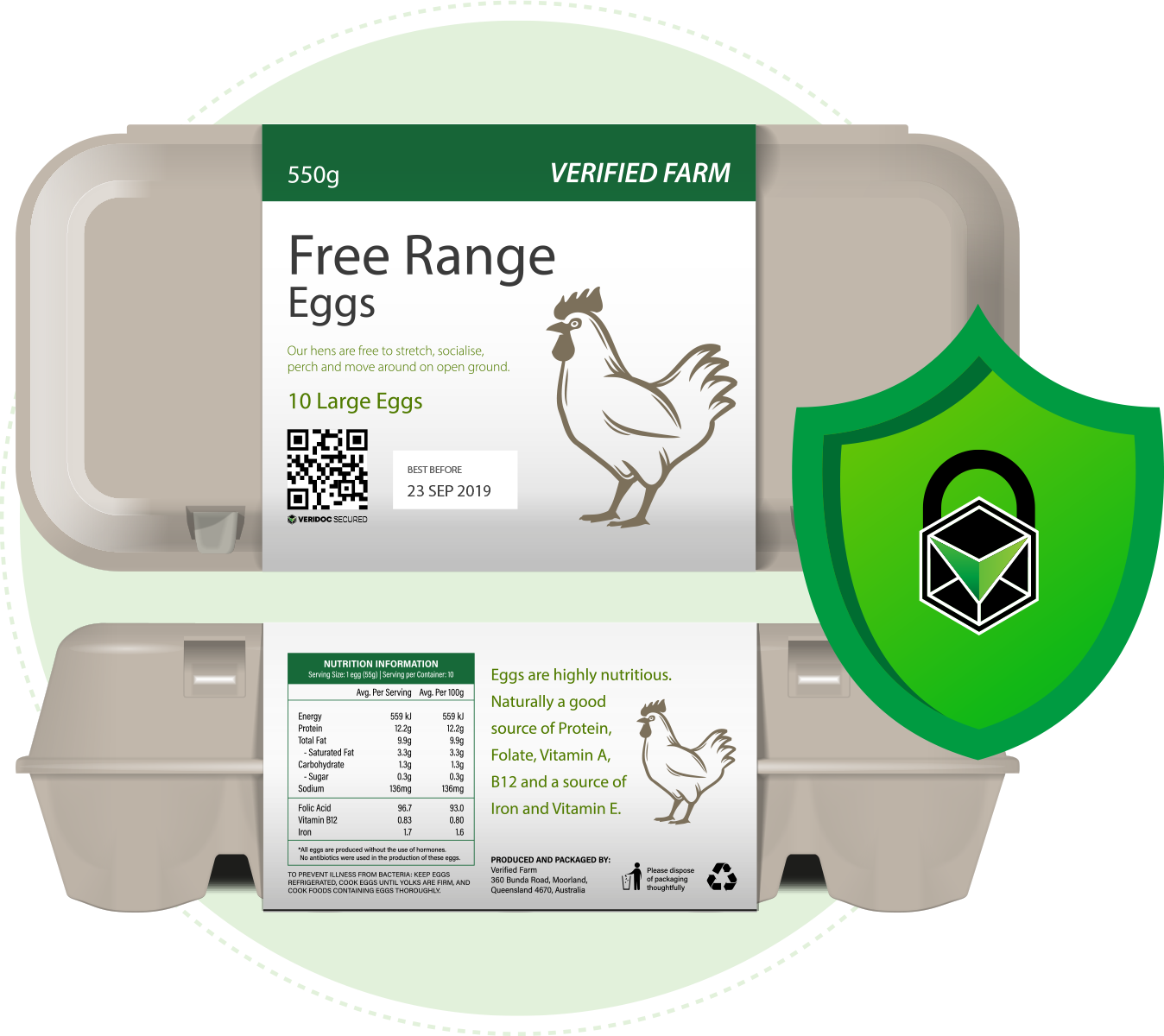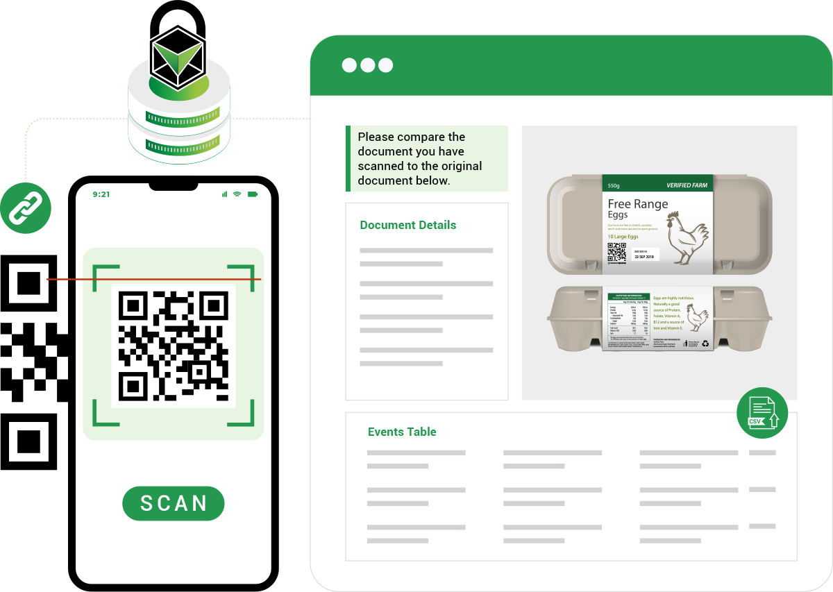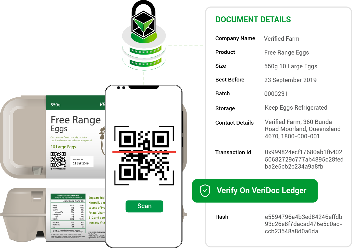 Free range eggs are often misrepresented, with many products falsely claiming free range classification. VeriDoc Global secures every pack with a blockchain-linked QR code that validates free range certification and verifies
