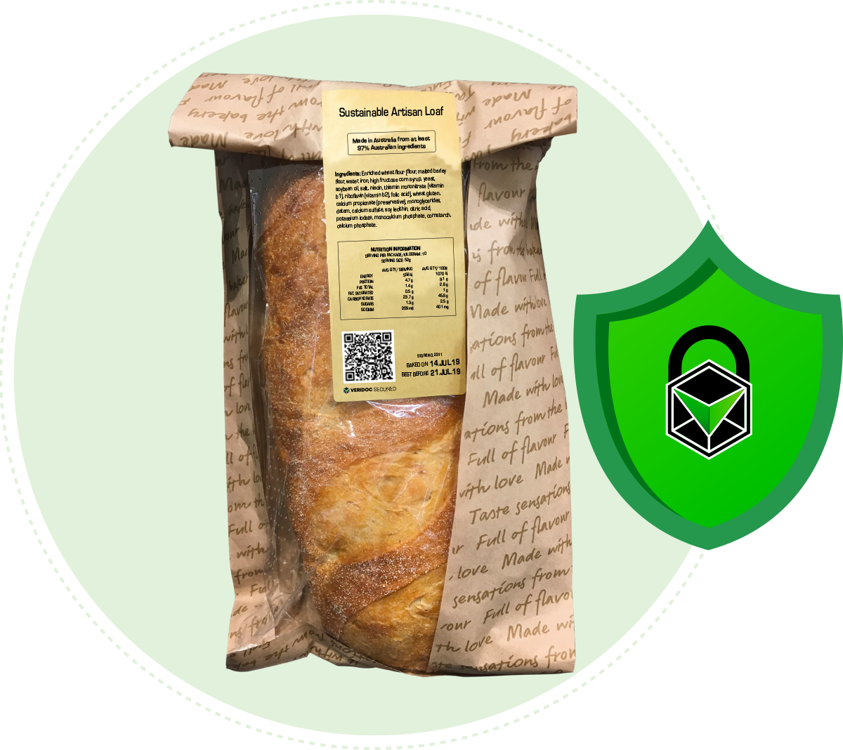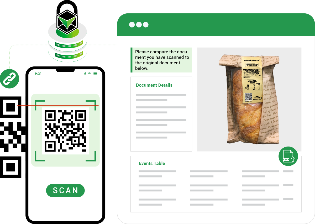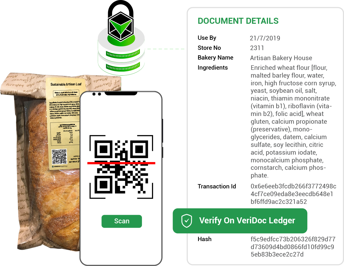 Scanning the QR code allows consumers and retailers to confirm that Sustainable Artisan Loaf packaging corresponds to the genuine product record stored on the VeriDoc Ledger.