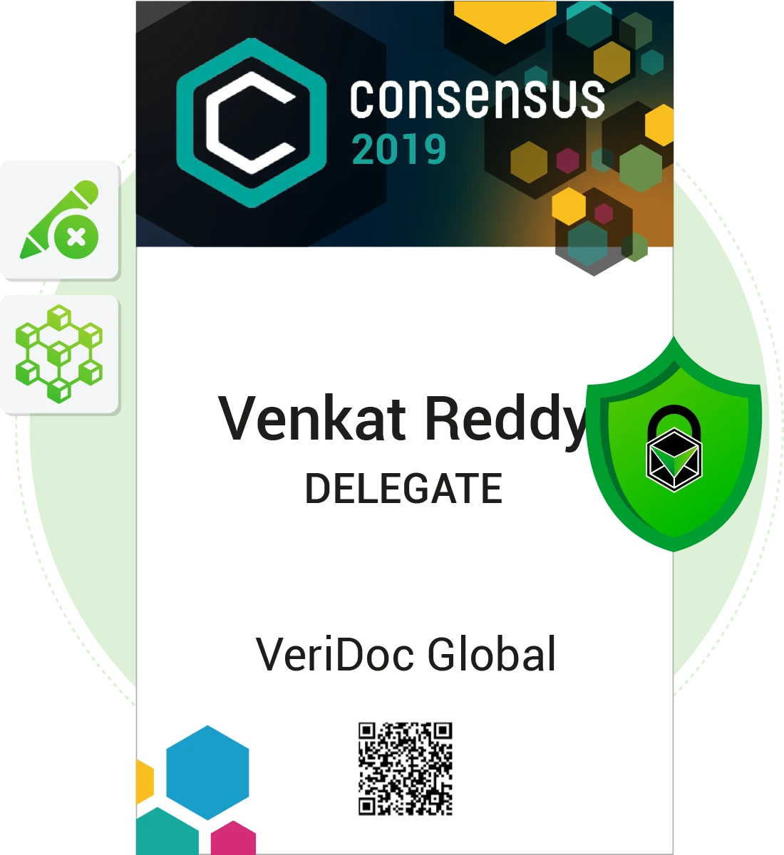 The Consensus 2019 Delegate ID Card was developed to authenticate attendees at one of the largest blockchain and cryptocurrency conferences worldwide. With thousands of participants, speakers, and sponsors, event security and verification efficiency were crucial. VeriDoc Global strengthened the delegate ID with blockchain-secured authentication to eliminate badge fraud and streamline entry processes.
