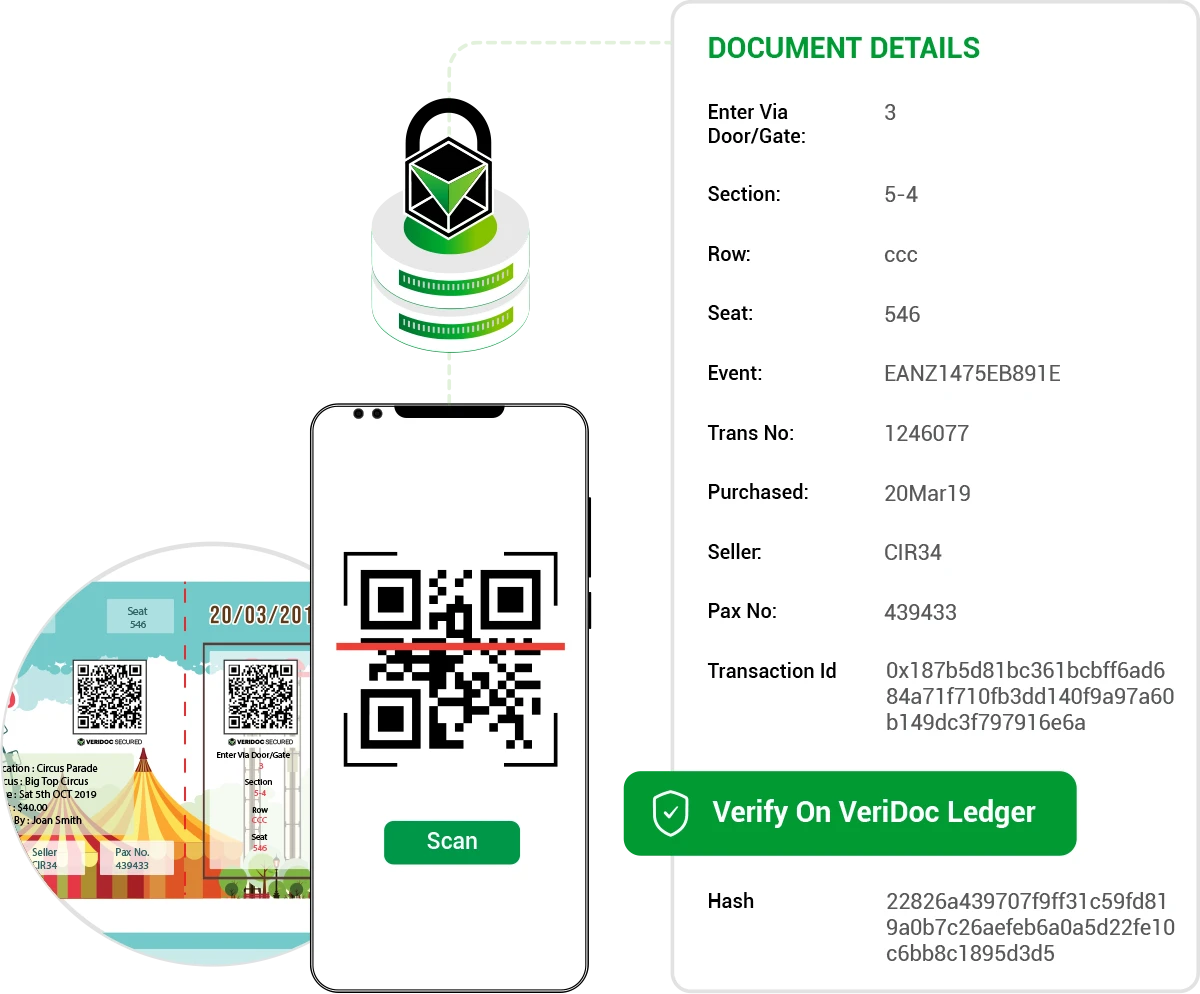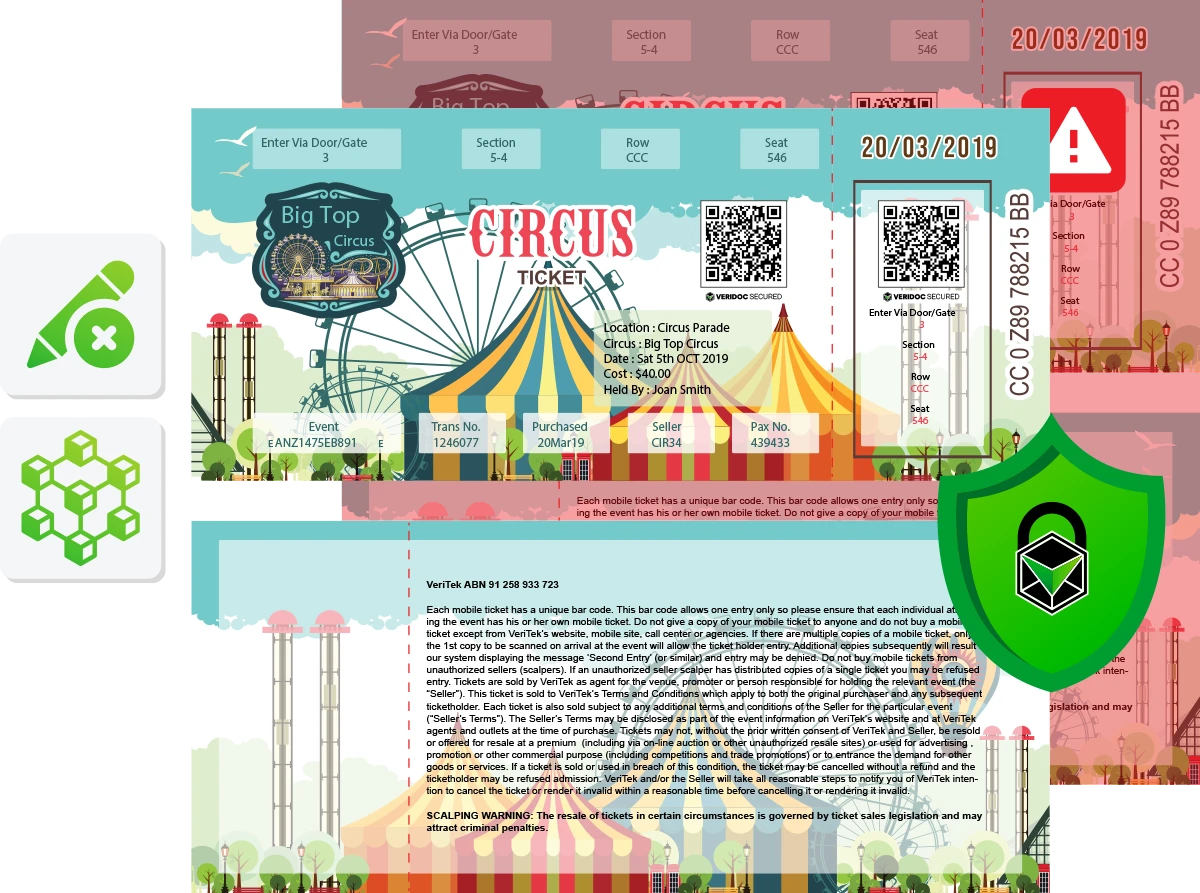 VeriDoc Global secures circus tickets by combining advanced cryptographic hashing with the VeriDoc Ledger to create a reliable and tamper-proof verification system. Key data such as ticket ID, attendee name, event details, seating or access information, and issue date are captured and converted into a secure digital fingerprint.