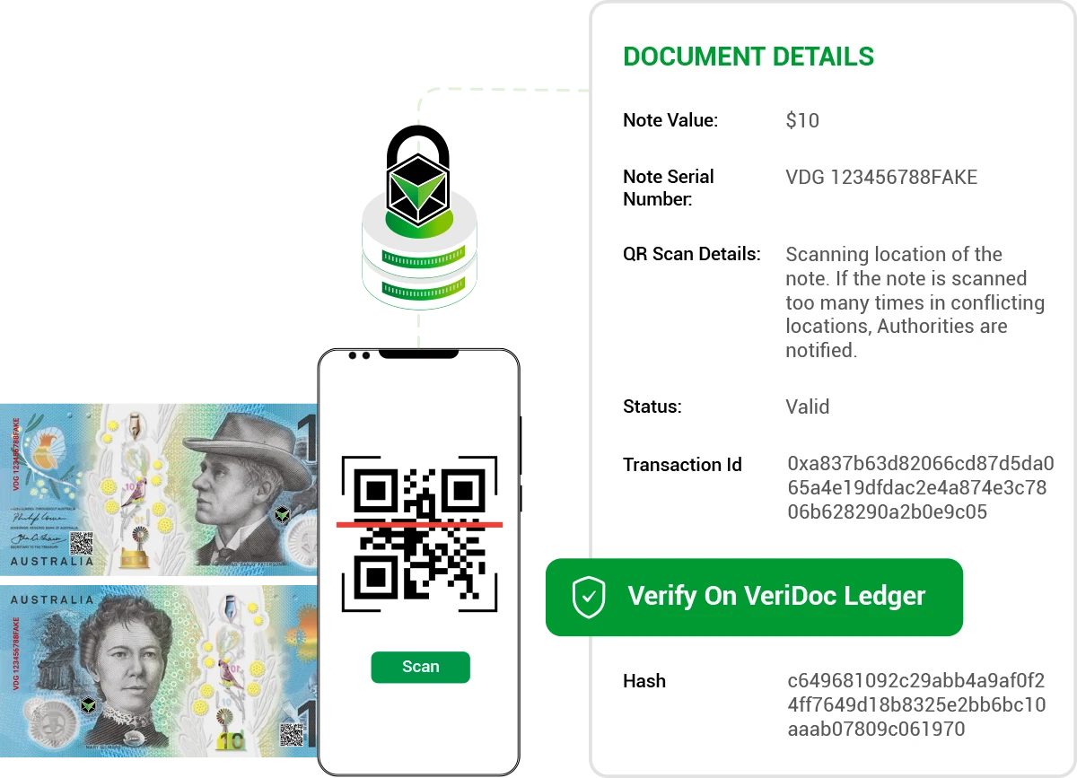The VDG $10 Bank Note POC showcases how VeriDoc Global secures currency by assigning each note a unique blockchain-verified identity. With one scan, users can instantly confirm whether a $10 note is genuine, preventing counterfeit circulation and ensuring trust in everyday transactions.