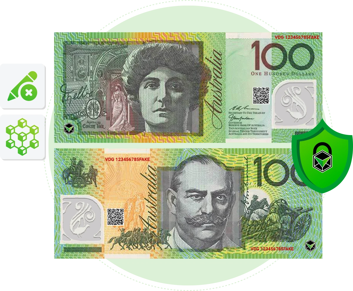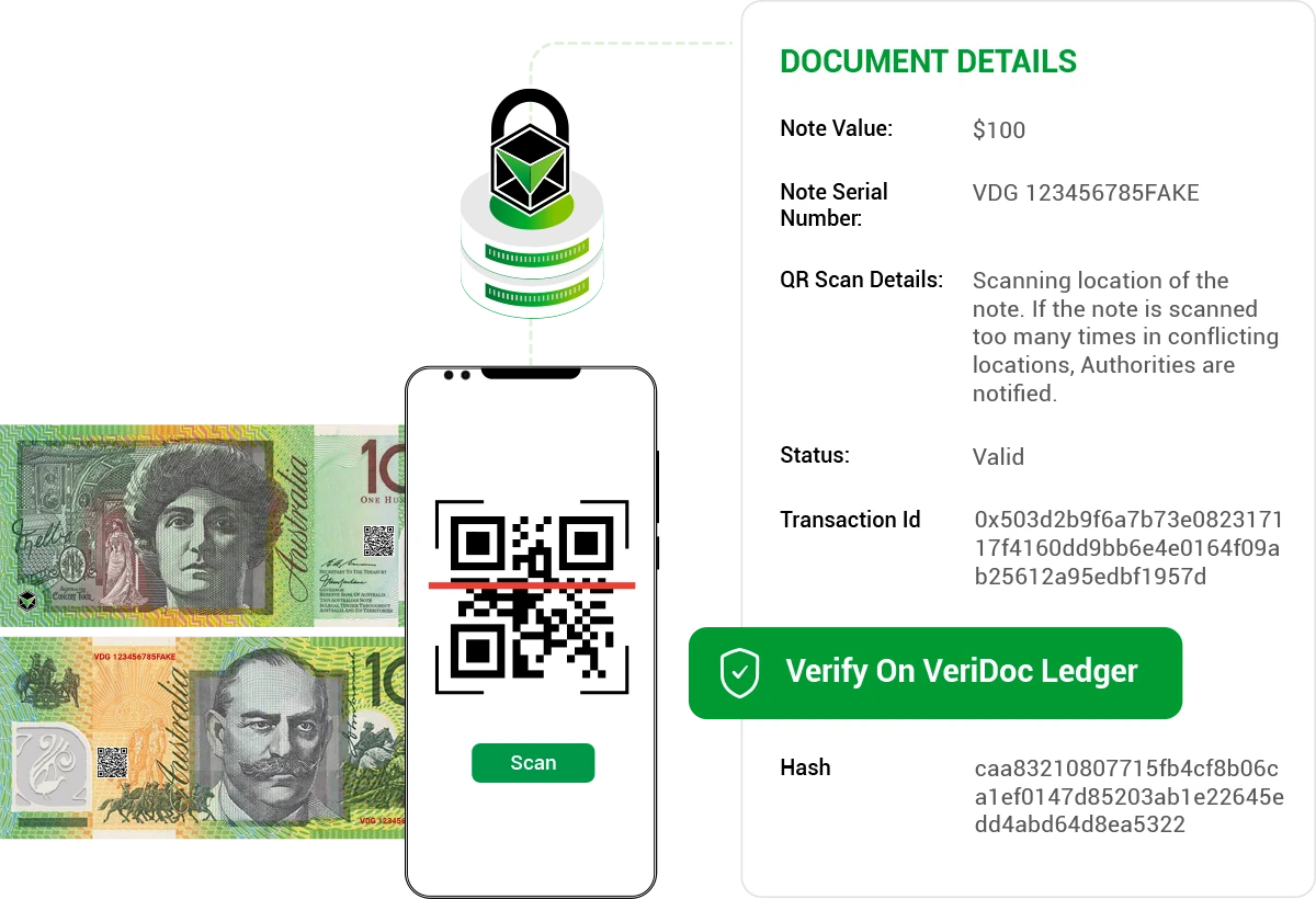 The VDG $100 Bank Note POC showcases VeriDoc Global’s currency protection using patented QR codes and blockchain verification. Each note carries a unique, tamper-proof digital identity that allows instant authentication, helping eliminate counterfeit risks and safeguarding high-value transactions.