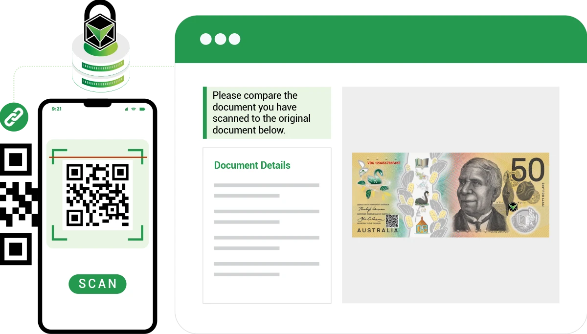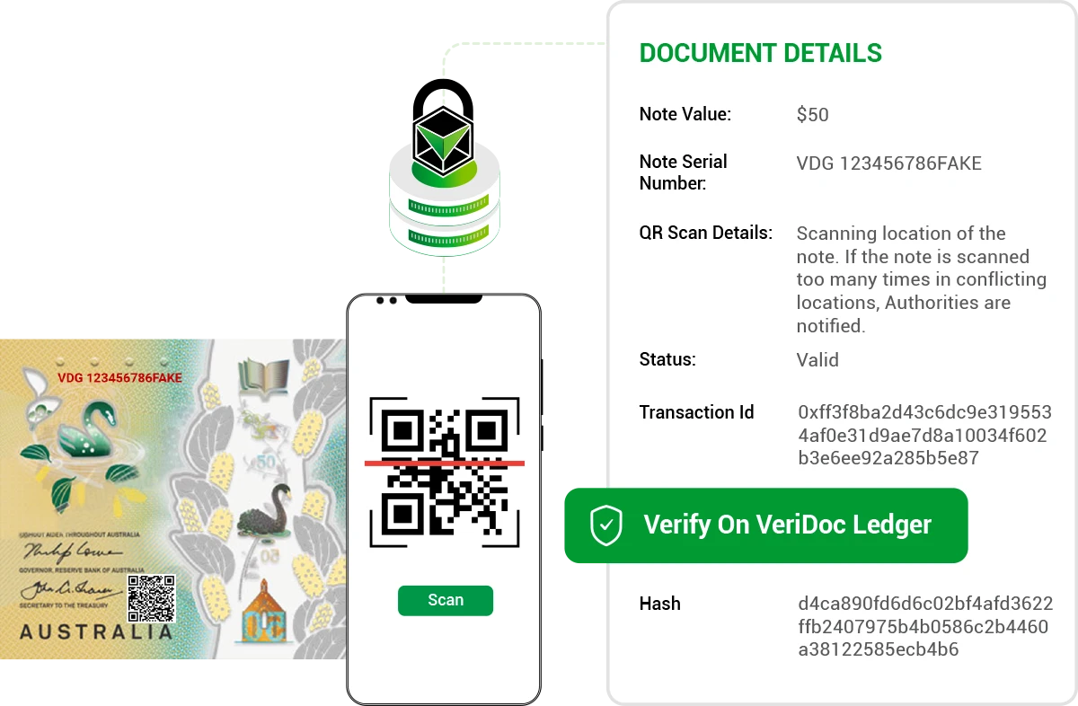 The VDG $50 Bank Note POC demonstrates how VeriDoc Global secures currency with advanced QR code technology and blockchain verification. Each note carries a unique, immutable identity that lets anyone instantly verify authenticity, helping reduce counterfeiting and protect everyday cash transactions.